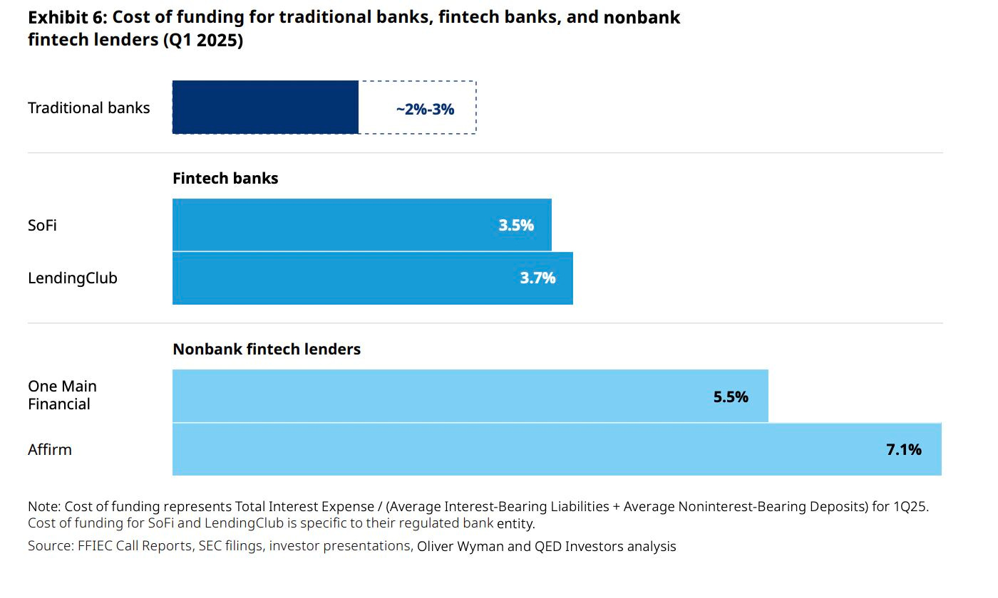 Affirm funds loans (the cost of the capital they lend) at around 7 percent through capital markets. A fintech bank like SoFi funds closer to 4 to 5 percent using deposits. 2 percent difference at scale is a lot of money.