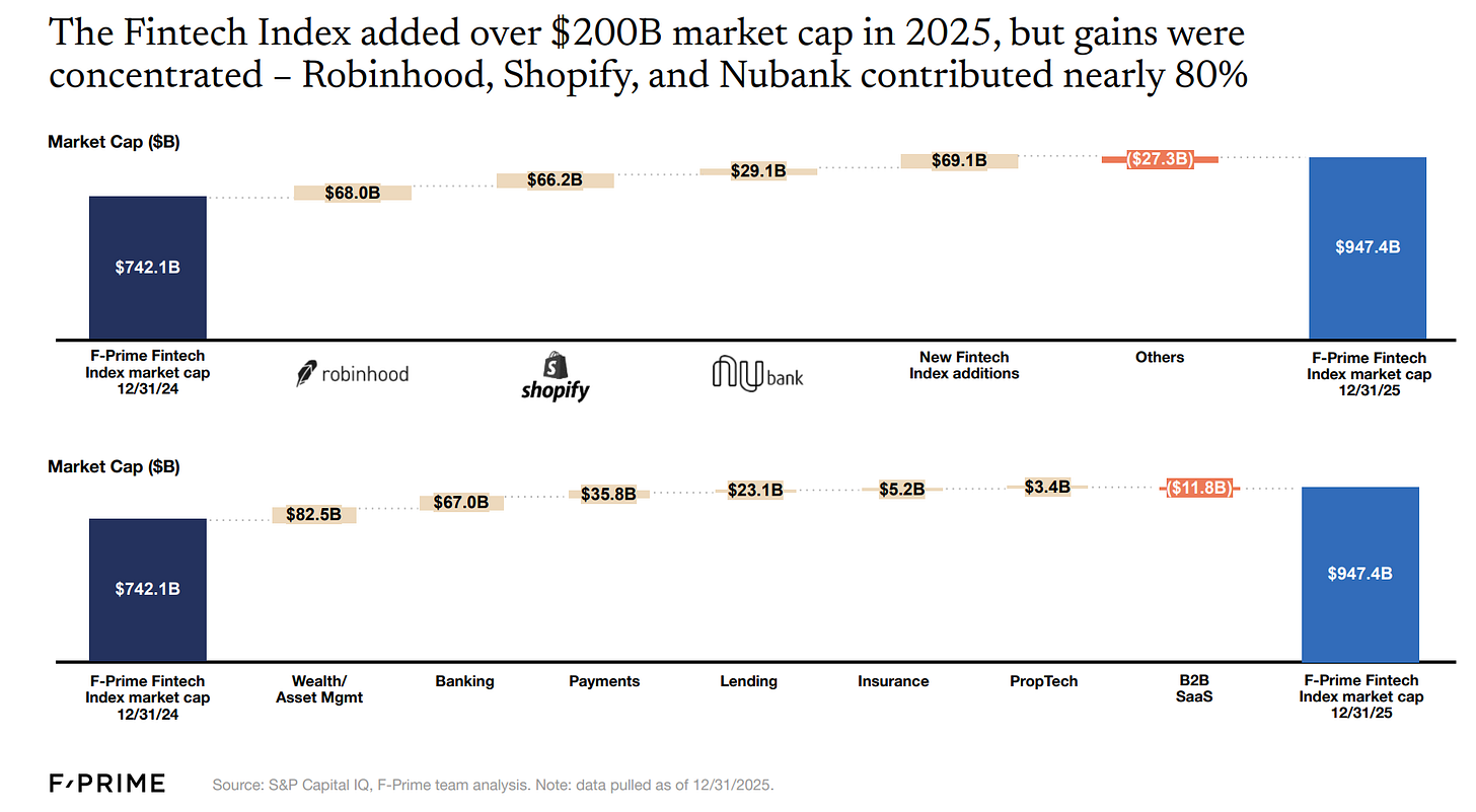State of Fintech 2026 report by FPrime went out and one of the slides that caught my attention was that their index added market cap of $200B but that return was concentrated in a few Fintechs (the hyperscalers): Robinhood, Shopify, and Nubank,
